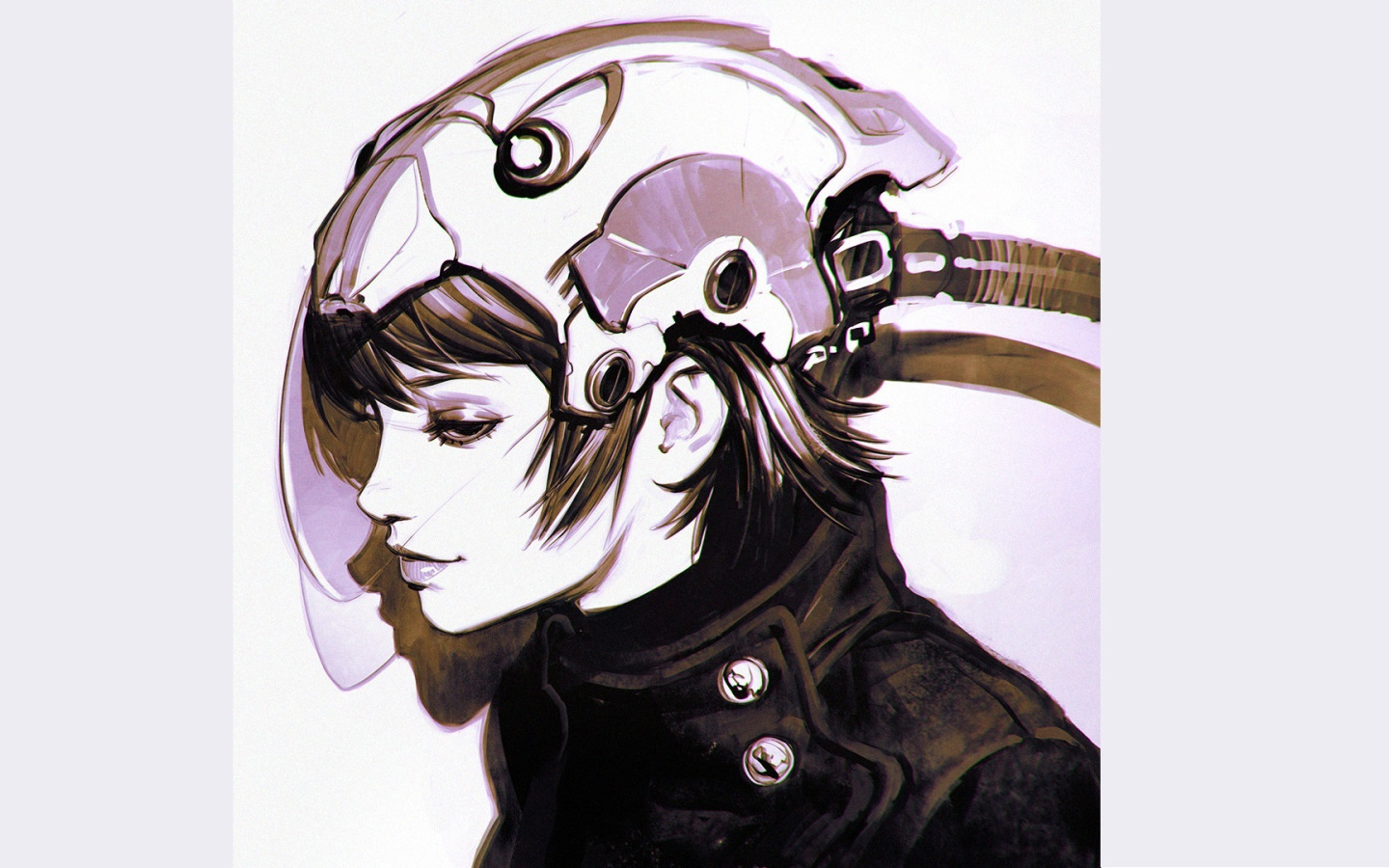 Назад к обои девушка, лицо, шлем, профиль, серый фон, Илья Кувшинов
