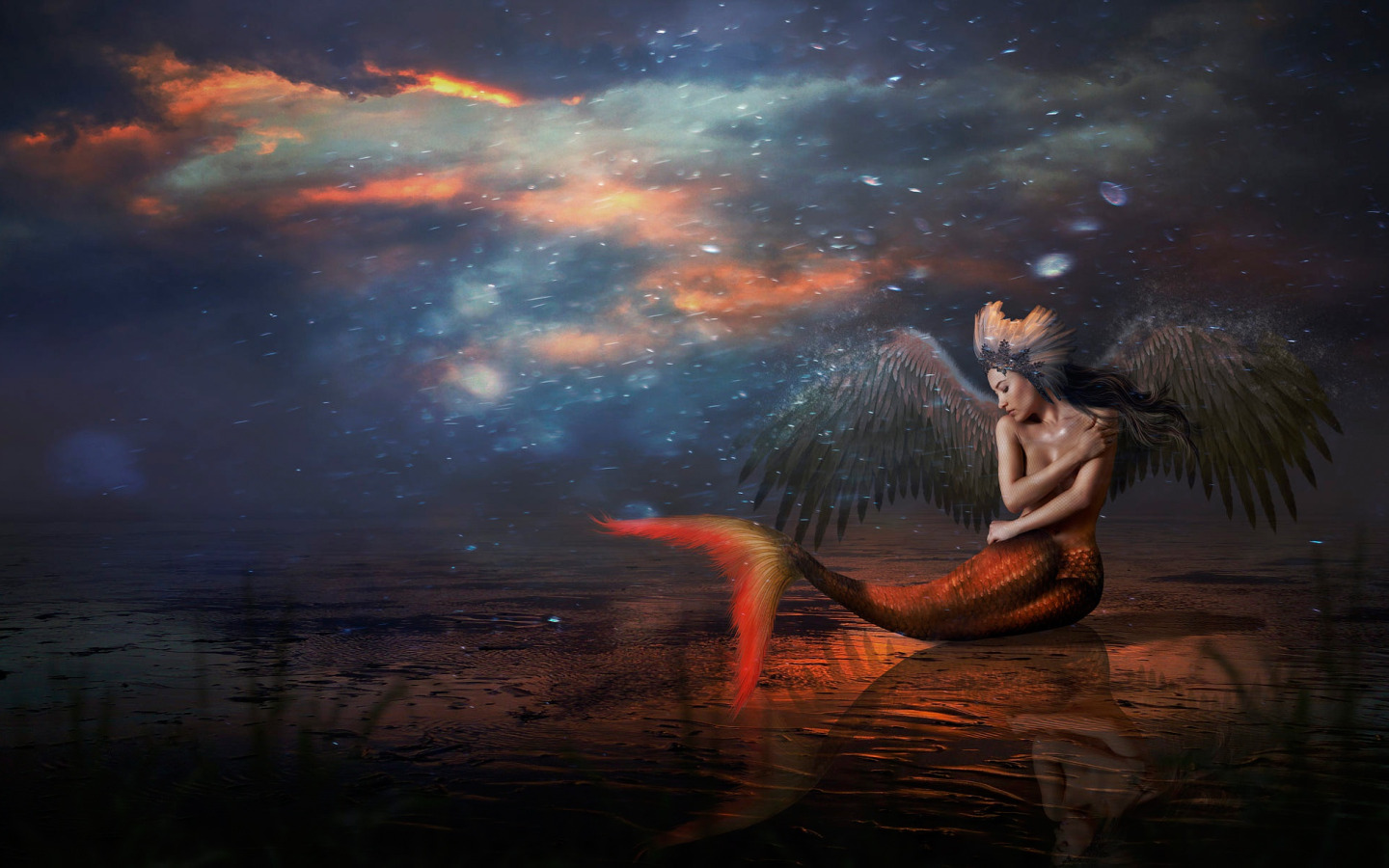 Назад к обои девушка, ночь, русалка, фэнтези, водоем, LINGDUMSTUDOG