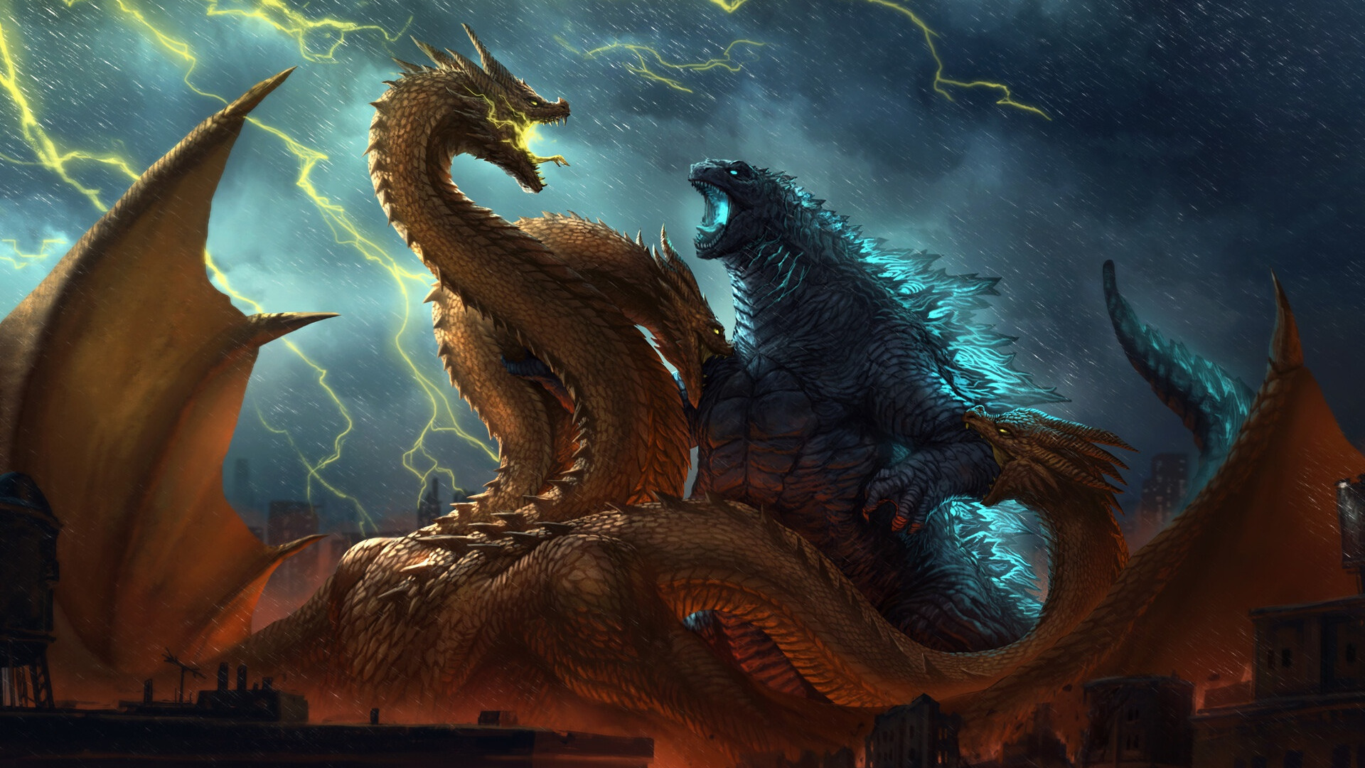 Назад к обои fantasy, Годзилла, rain, Lightning, art, Godzilla, Kaiju, Creatures