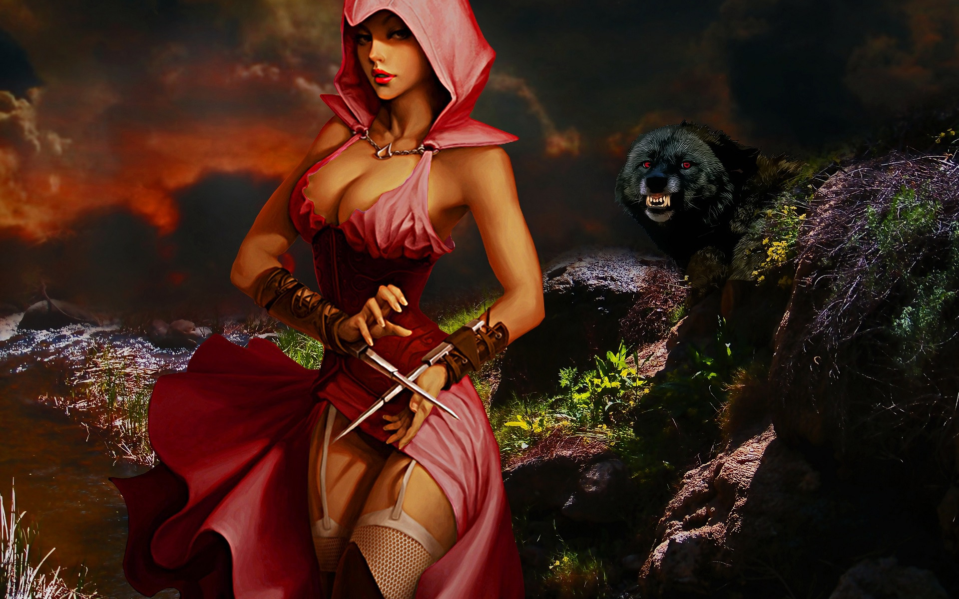 девушка, ночь, волк