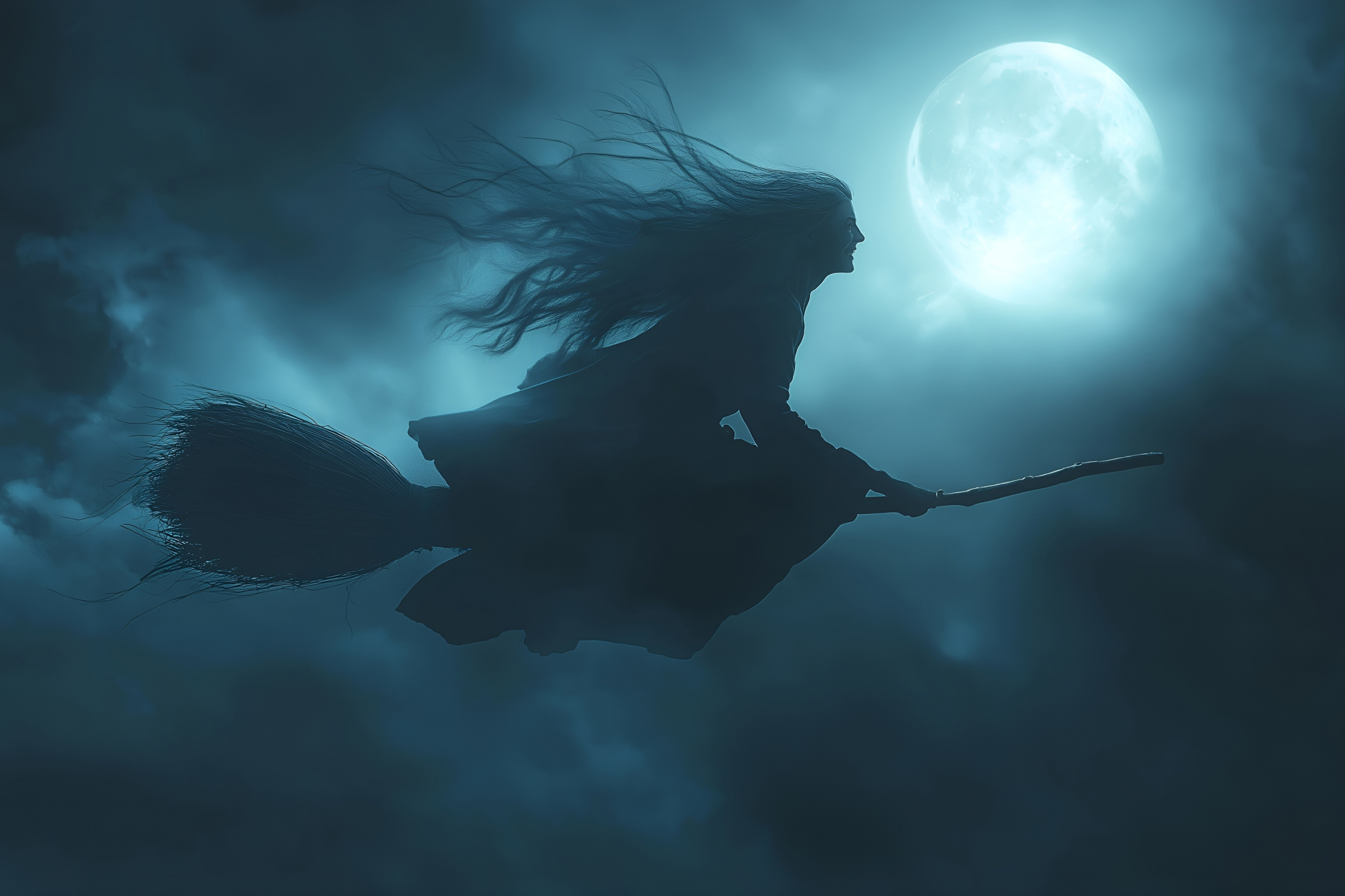 полет, ночь, луна, ведьма, метла, цифровое искусство, ИИ-арт, Искусство искусственного интеллекта