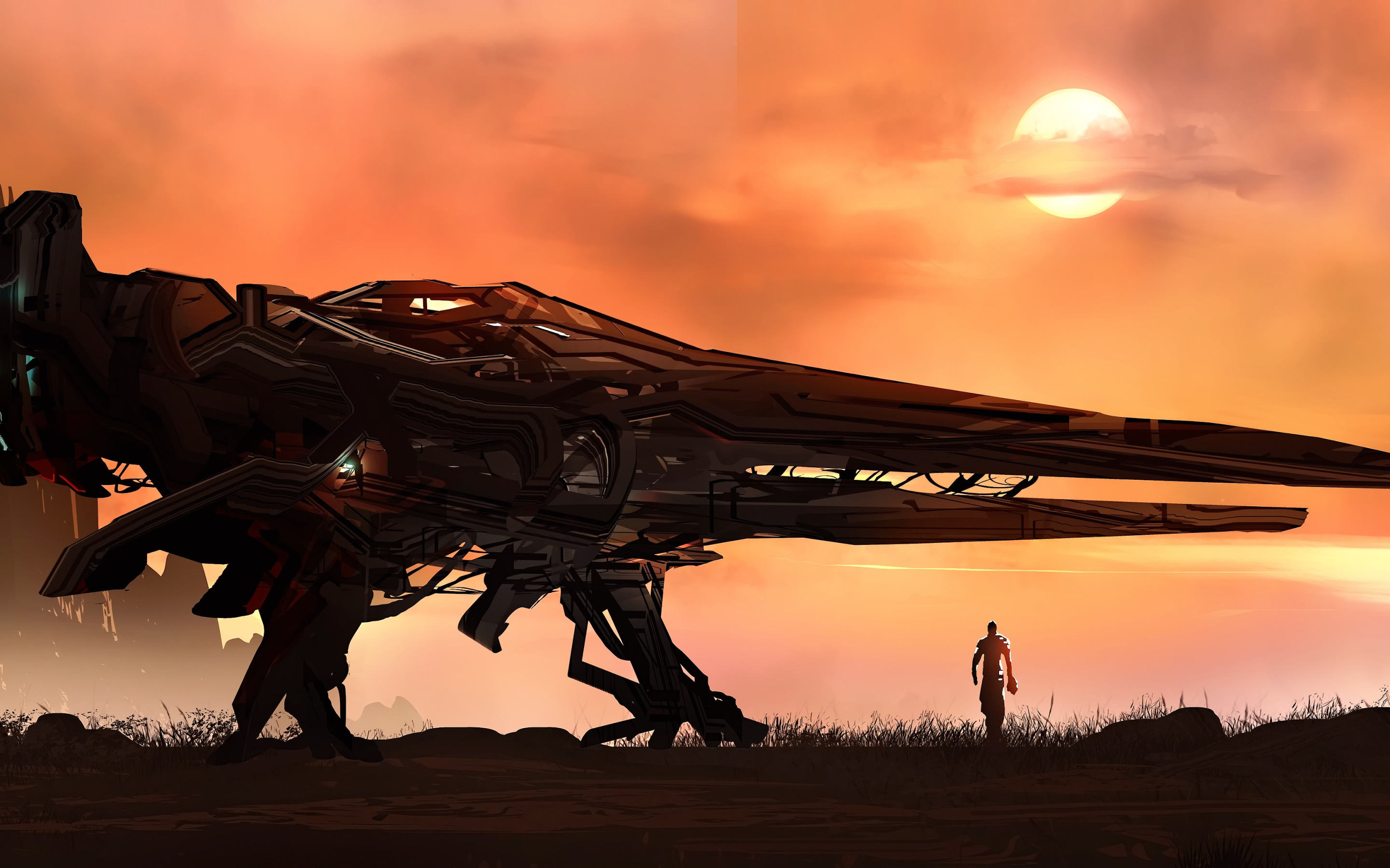 fantasy, science fiction, sun, spaceship, man, sci-fi, digital art, artwork