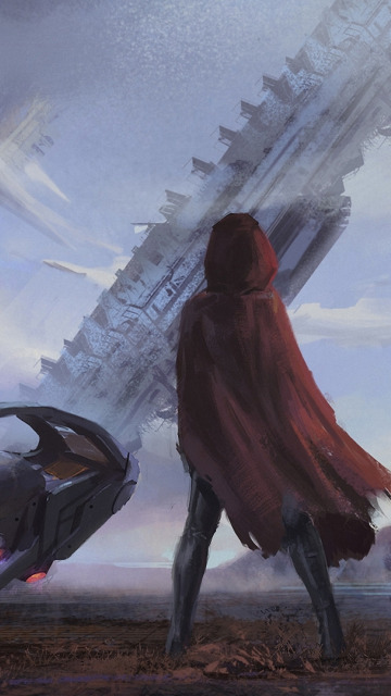 Назад к обои девушка, красный, корабль, башня, сооружение, арт, мотоцикл, плащ