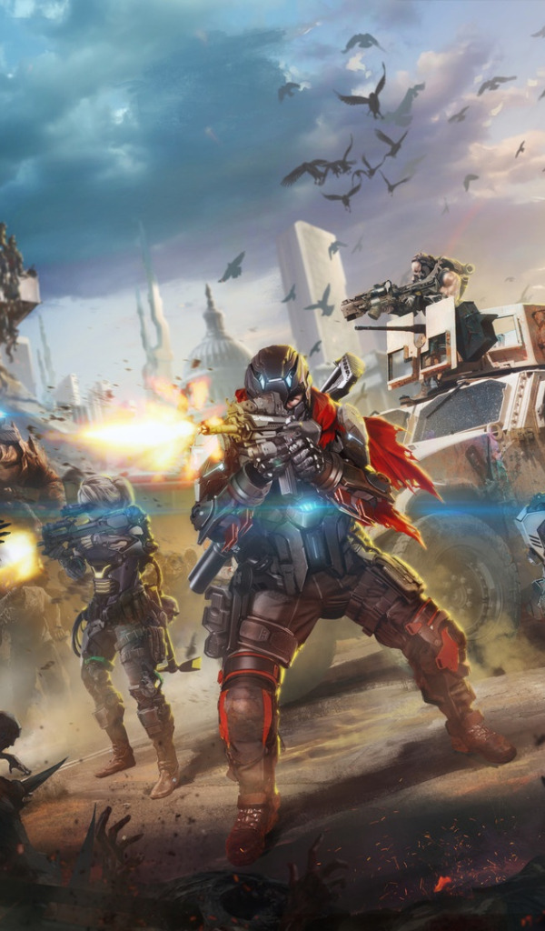 Назад к обои город, огни, фантастика, атака, монстр, демон, солдат, битва