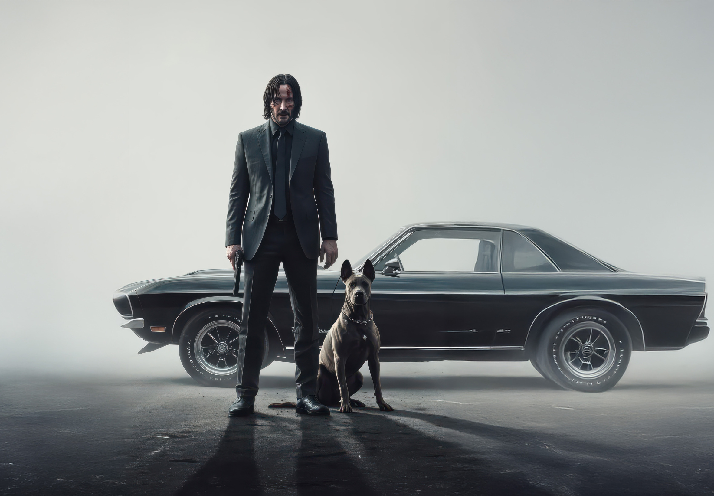 car, gun, dog, man, Dodge Charger, assasin, Keanu Reeves, suit