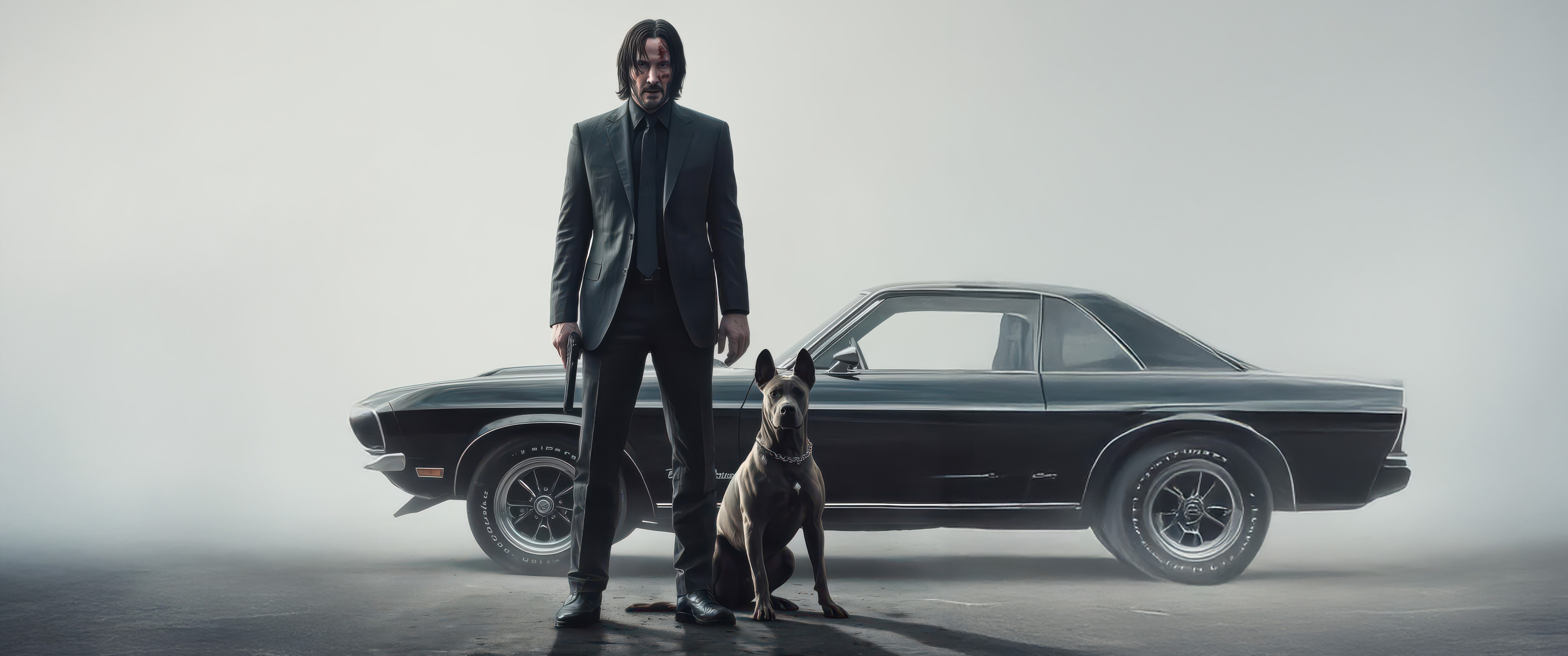 car, gun, dog, man, Dodge Charger, assasin, Keanu Reeves, suit