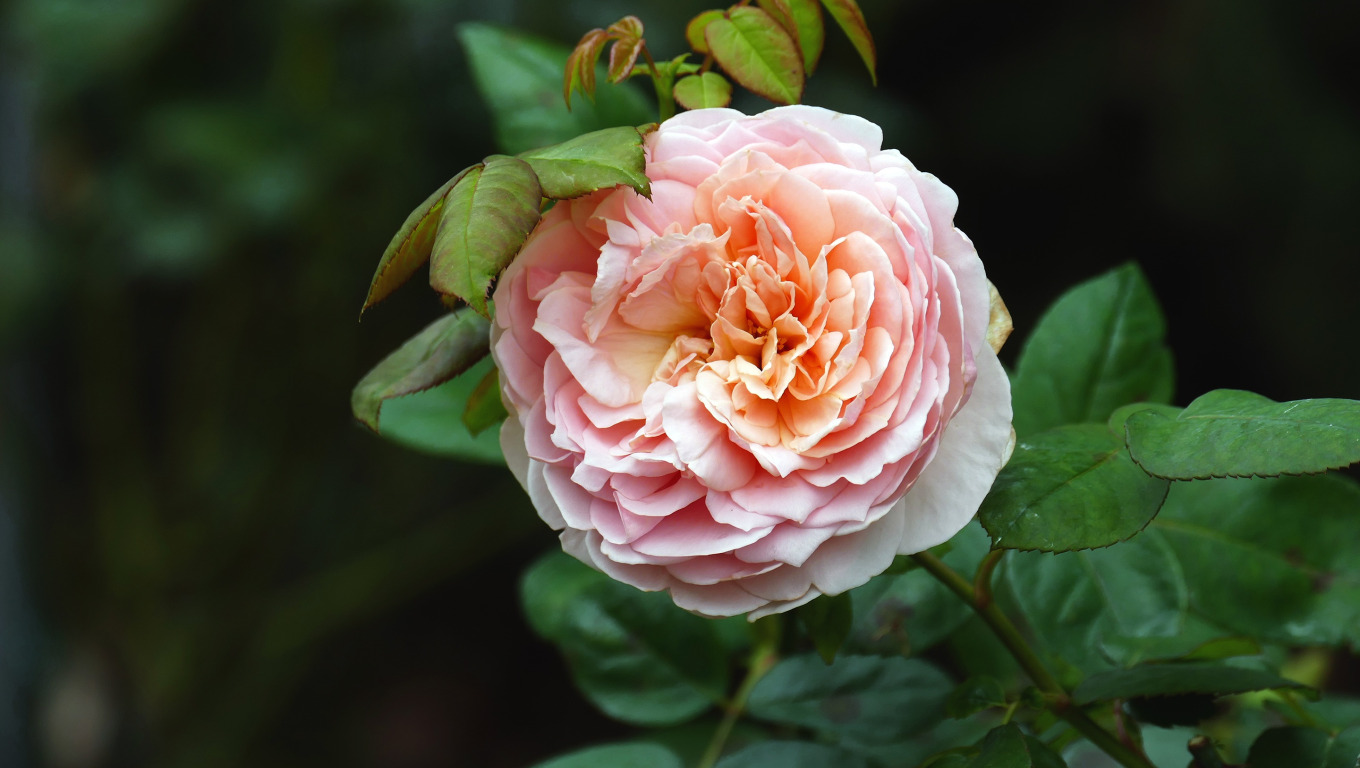 листья, темный фон, розы, сад, бутоны, пышная, персиковый