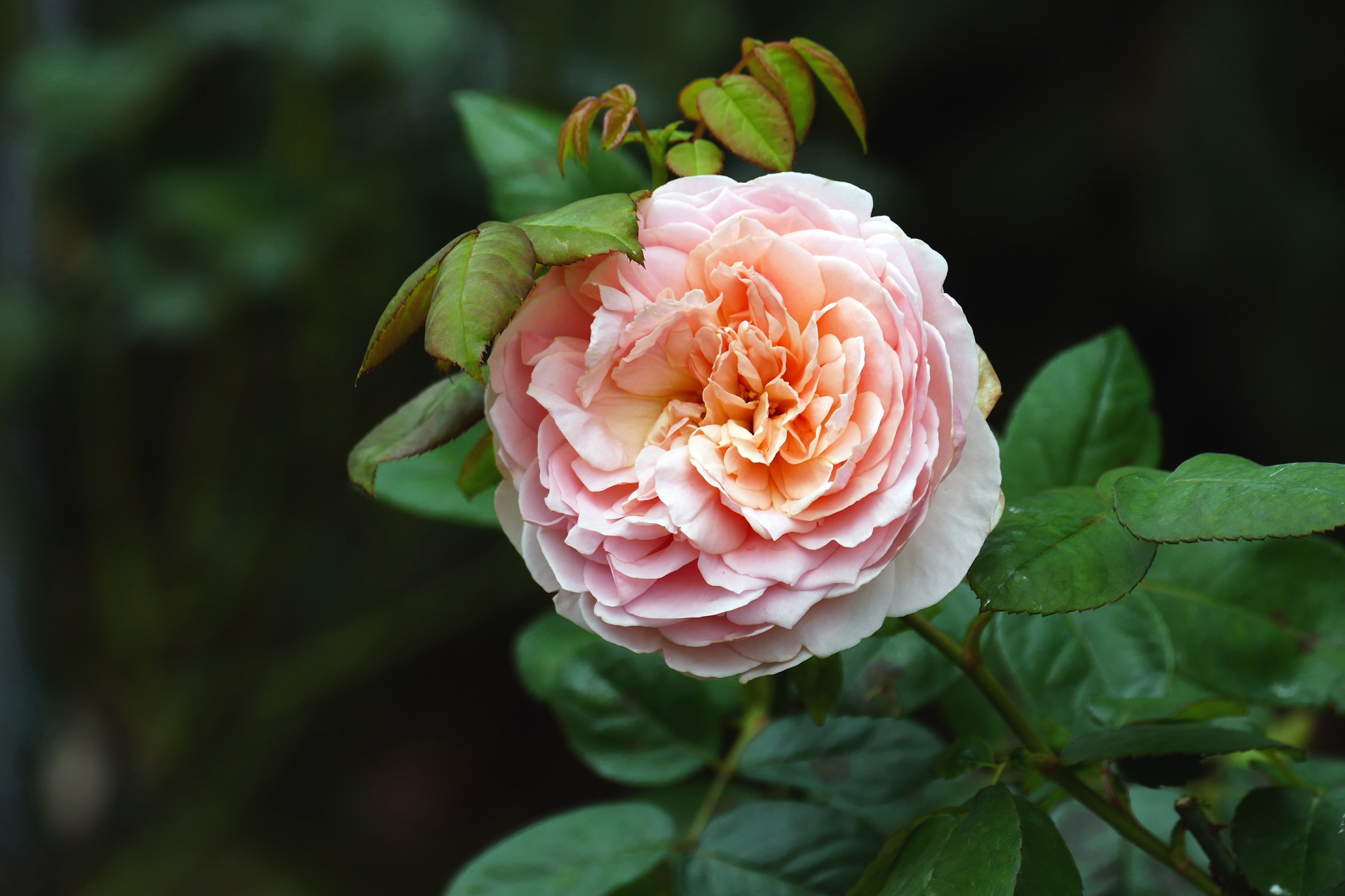 листья, темный фон, розы, сад, бутоны, пышная, персиковый