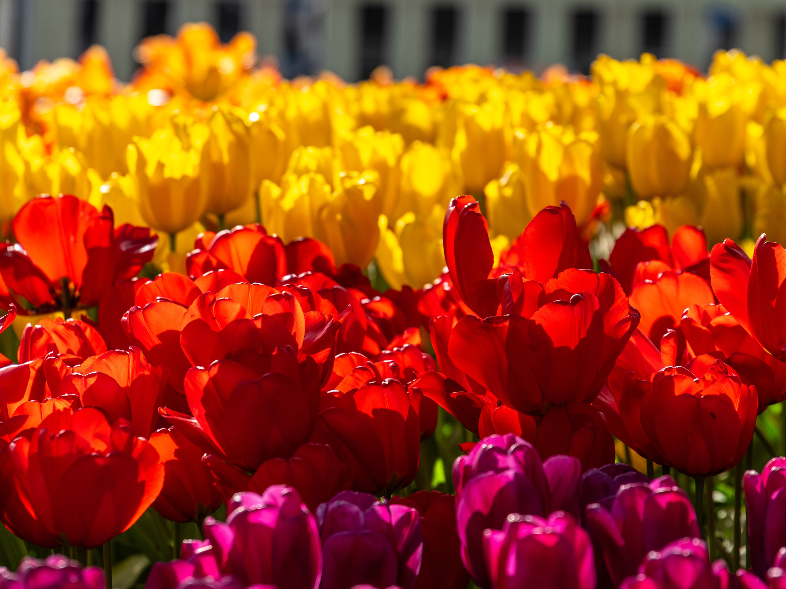 свет, цветы, желтый, красный, яркие, весна, тюльпаны, розовые