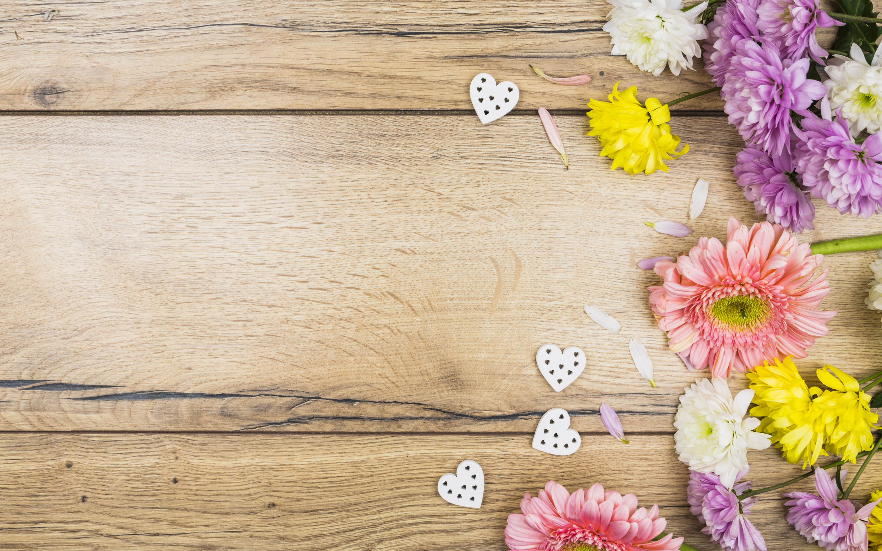 цветы, colorful, сердечки, хризантемы, wood, pink, flowers, romantic