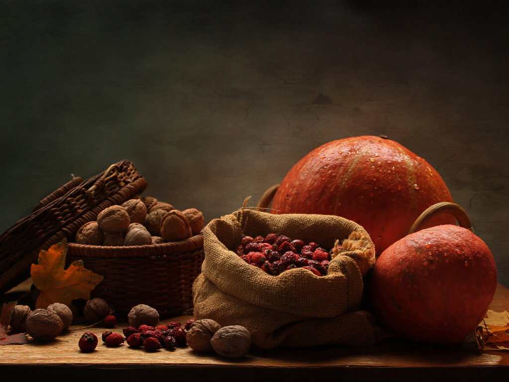 Назад к обои листья, желтый, стол, корзина, тыква, орехи, натюрморт, мешок