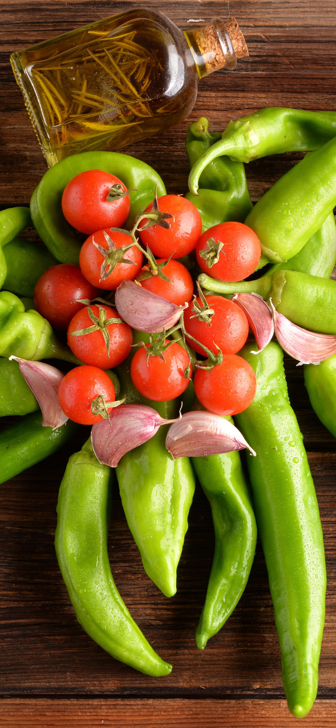 Назад к обои доски, мокрая, перец, овощи, помидоры, вид сверху, чеснок, бутылёк