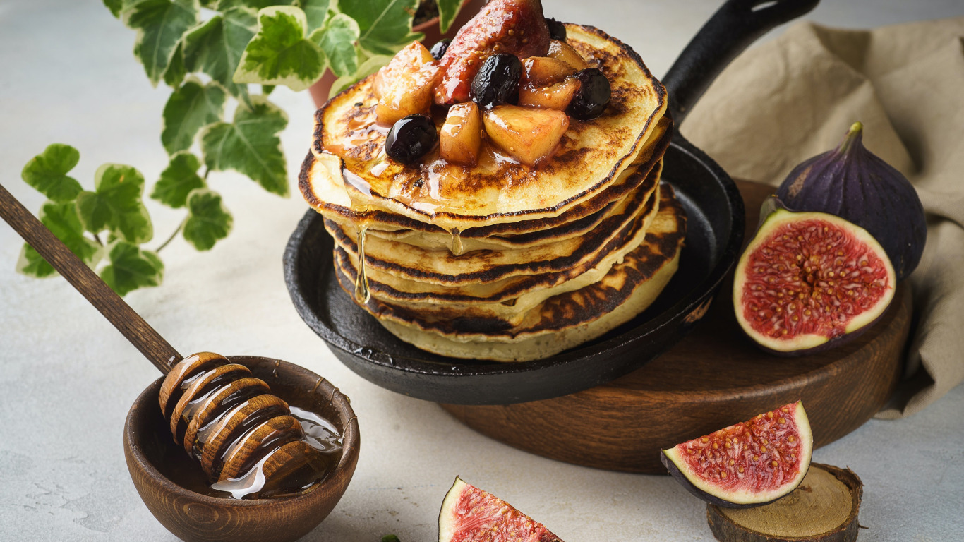 Назад к обои стол, мед, стопка, фрукты, блины, выпечка, подставка, плющ