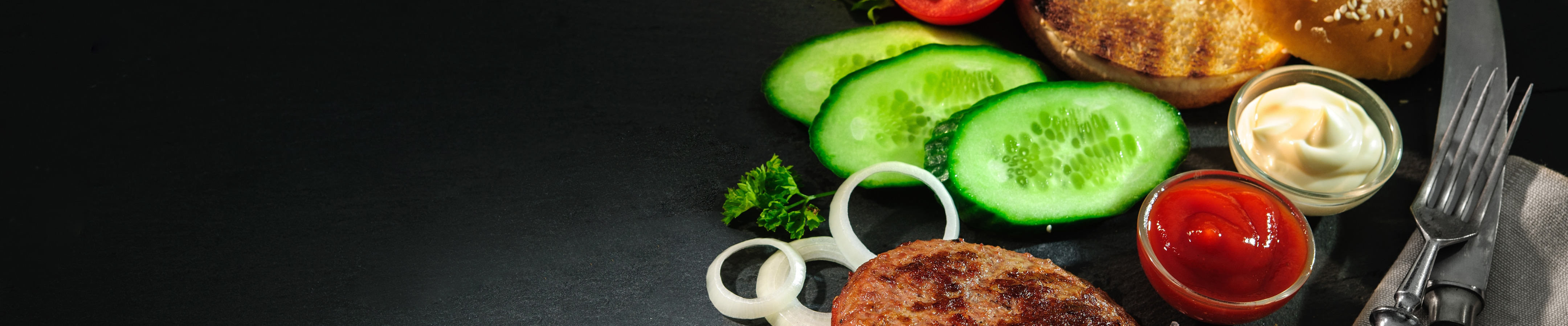 Назад к обои зелень, помидоры, котлета, огурцы, кушанье