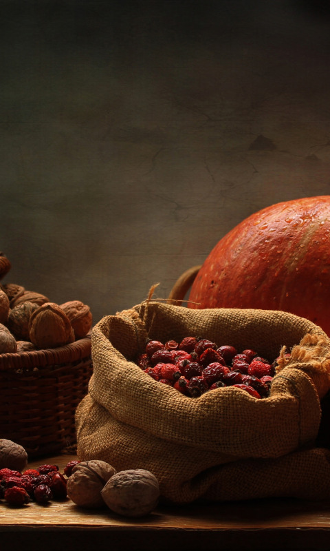 Назад к обои листья, желтый, стол, корзина, тыква, орехи, натюрморт, мешок