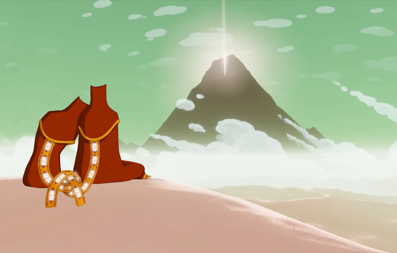 Песок, солнце, горы, пустыня, фигура, арт, сидя, journey обои на телефон (фото, картинки)