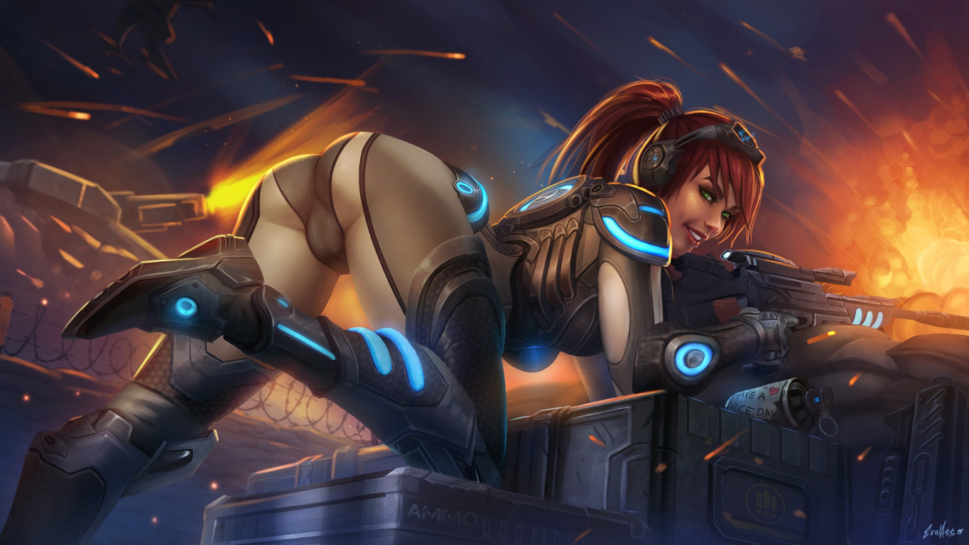 девушка, оружие, арт, искры, костюм, автомат, starcraft, рыжая