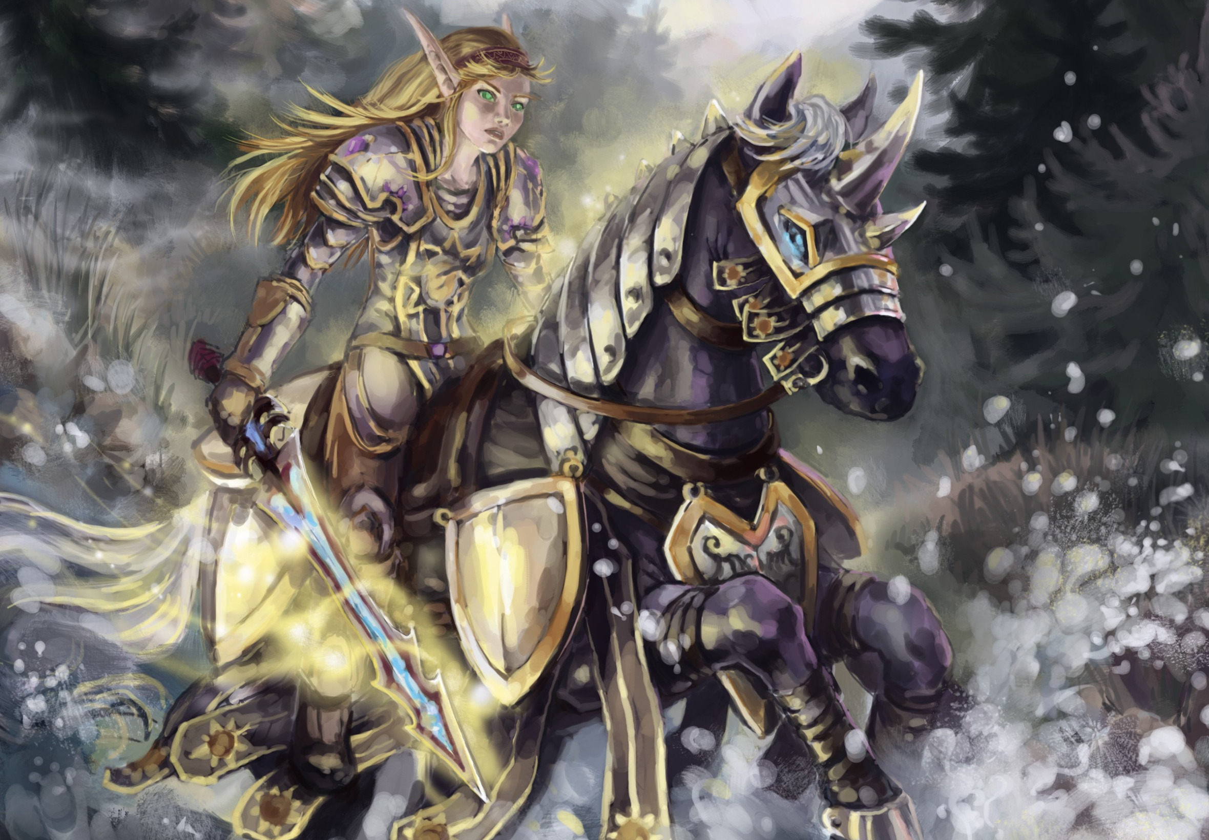 Назад к обои лес, конь, меч, арт, бег, World of Warcraft, эльфийка, wow