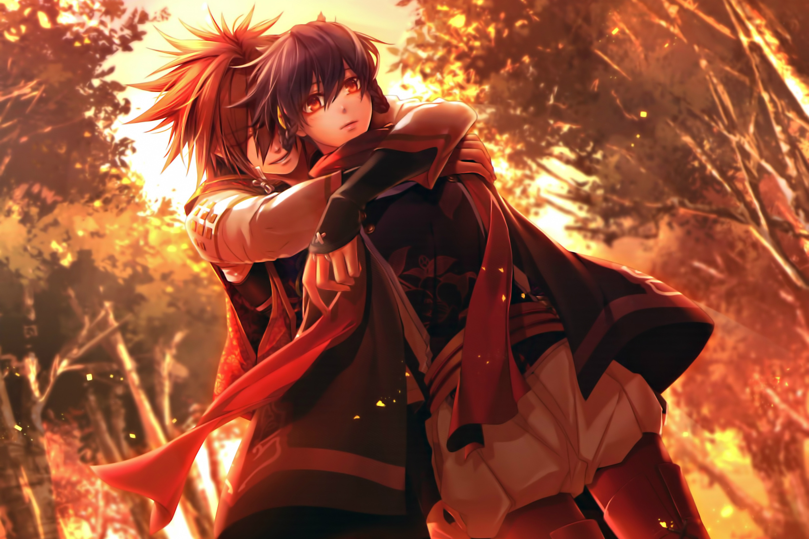 Назад к обои деревья, шарф, костюм, двое, art, обьятия, visual novel, miko