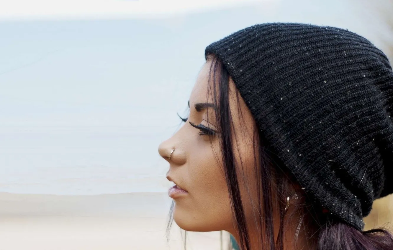 Девушка, лицо, ресницы, шапка, пирсинг, профиль обои на телефон (фото, картинки)