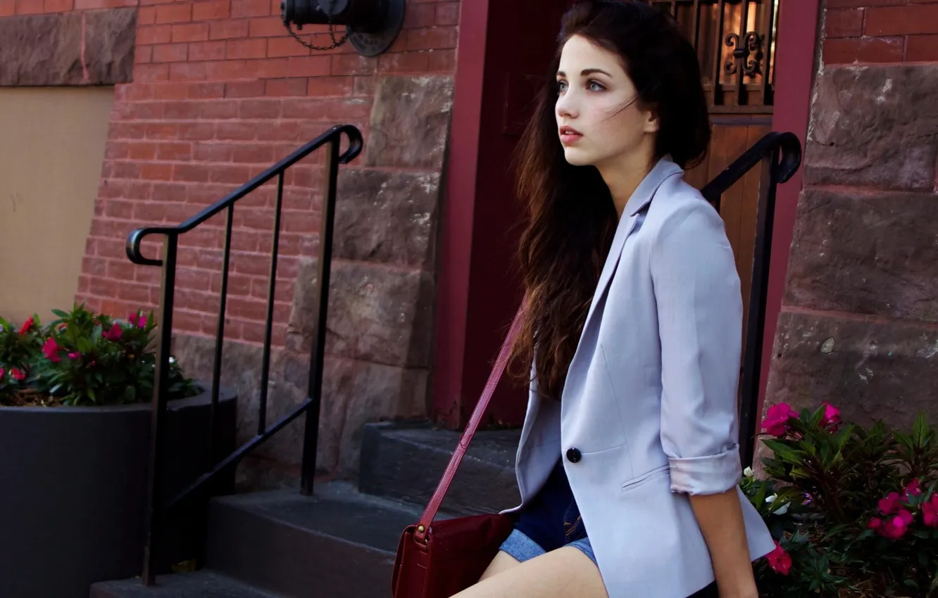 Девушка, цветы, модель, брюнетка, лестница, сумка, model, brunette обои на телефон (фото, картинки)