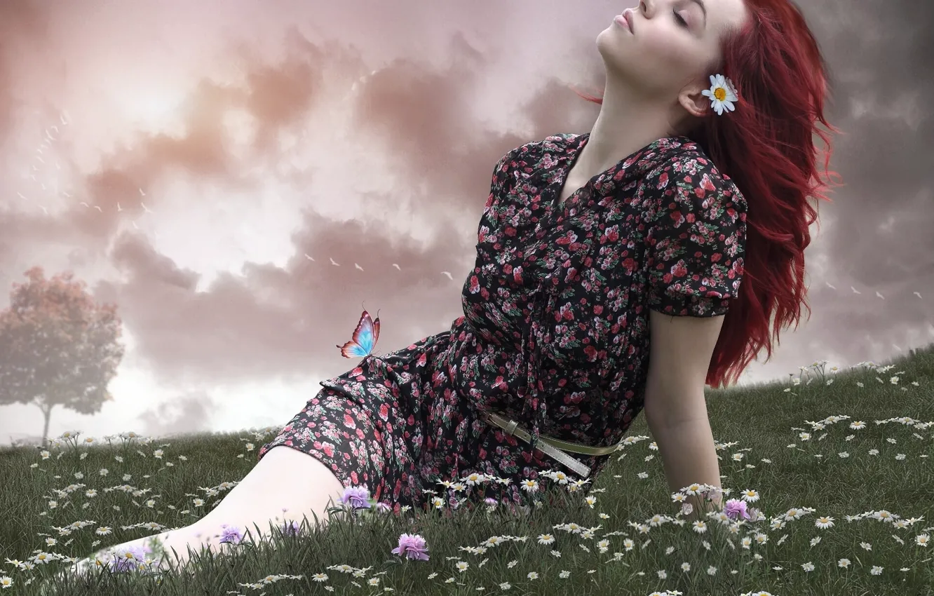 Девушка, цветы, настроение, бабочка, ромашки, луг обои на телефон (фото, картинки)
