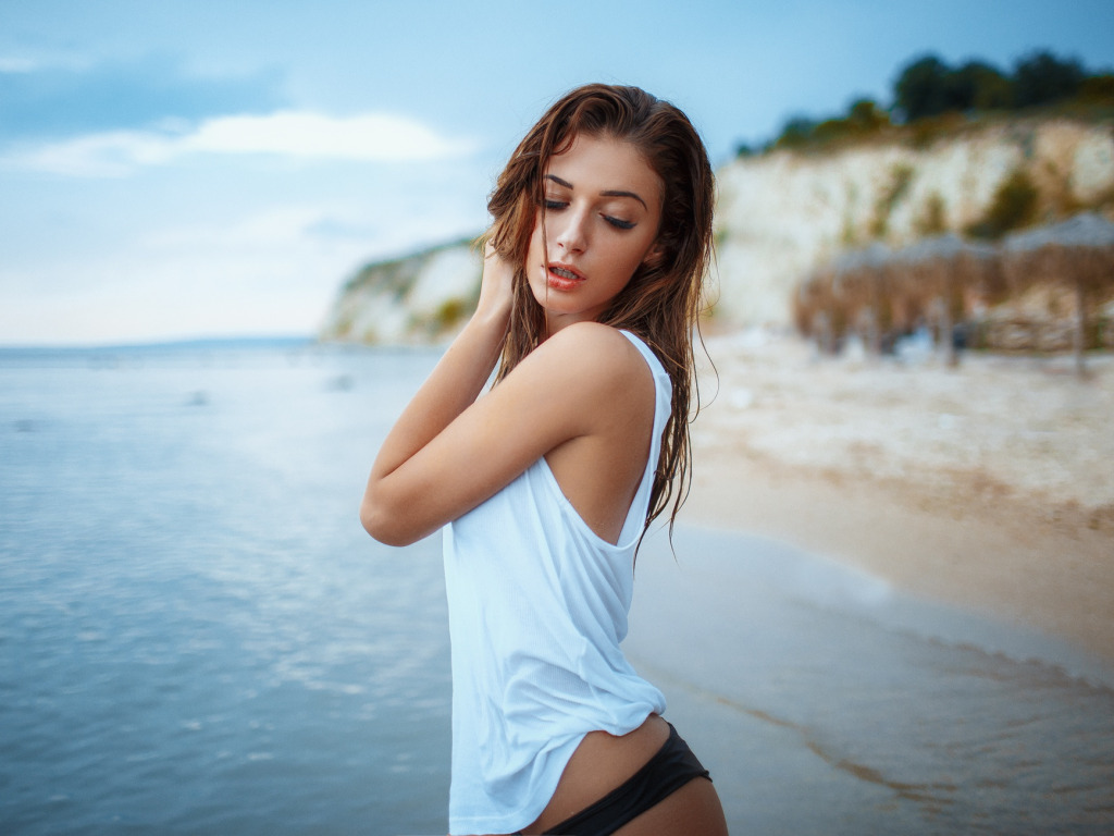 Назад к обои море, девушка, поза, руки, майка, Деян Романов