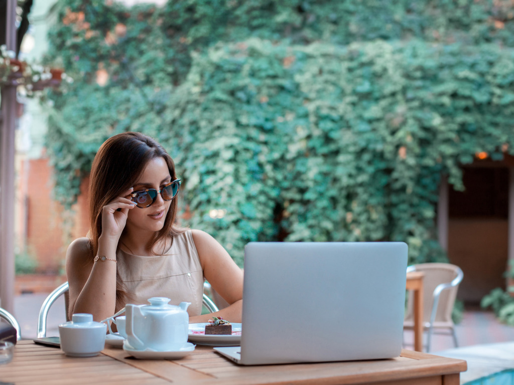Назад к обои девушка, поза, чай, макияж, очки, прическа, ноутбук, шатенка