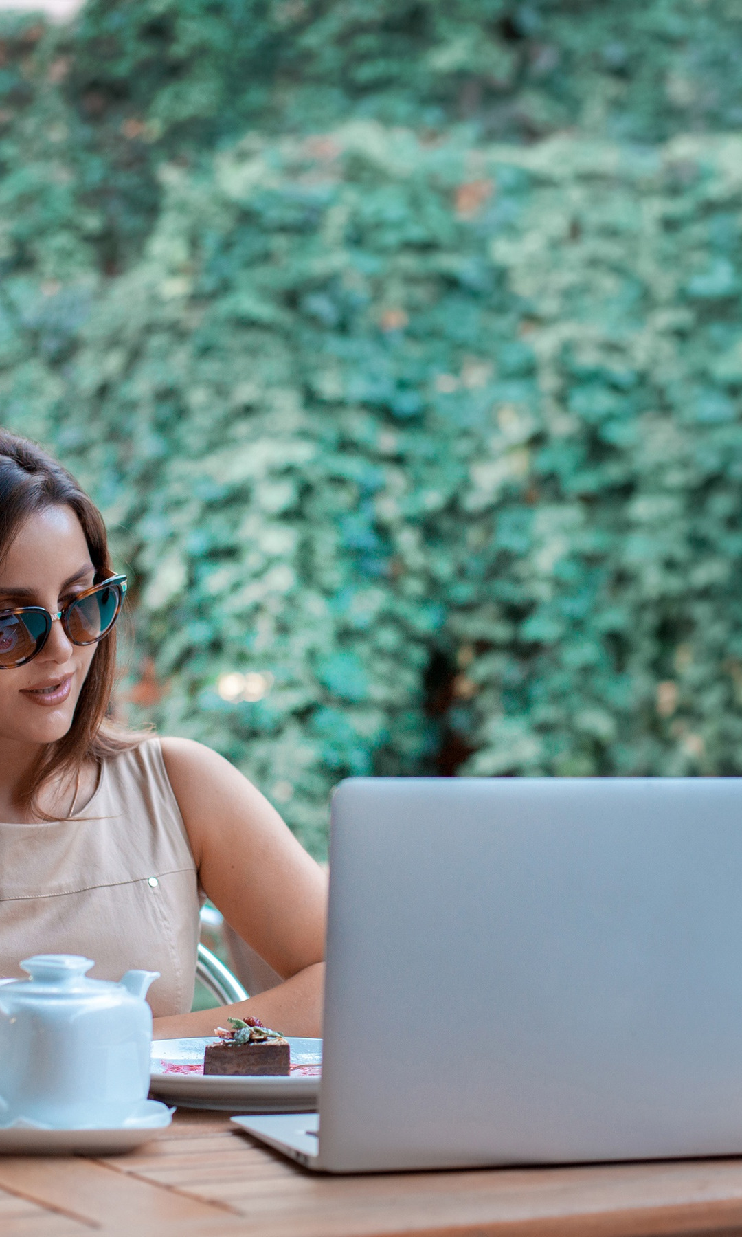 Назад к обои девушка, поза, чай, макияж, очки, прическа, ноутбук, шатенка