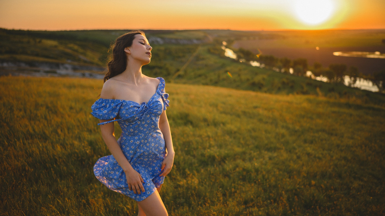 лето, девушка, закат, поза, настроение, руки, платье, плечи