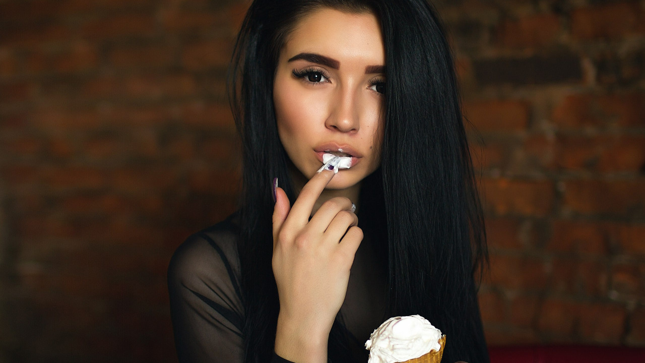 поза, модель, портрет, макияж, брюнетка, прическа, губы, мороженое
