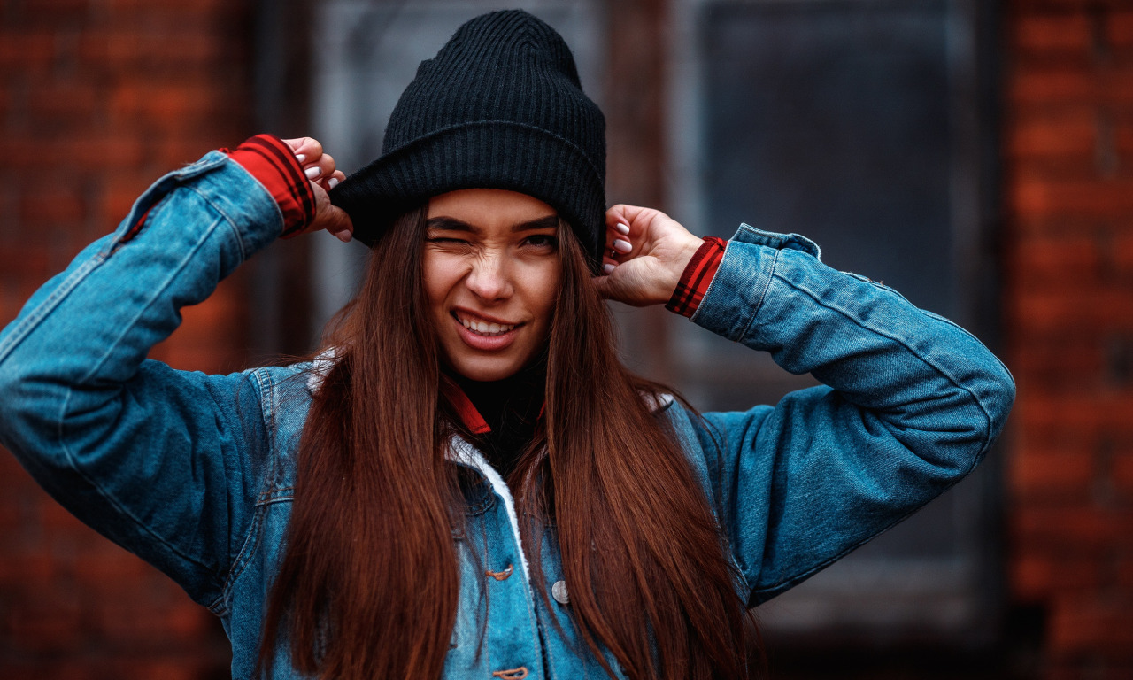 Назад к обои взгляд, девушка, поза, улыбка, модель, шапка, джинсовая куртка, Николай Рогозин