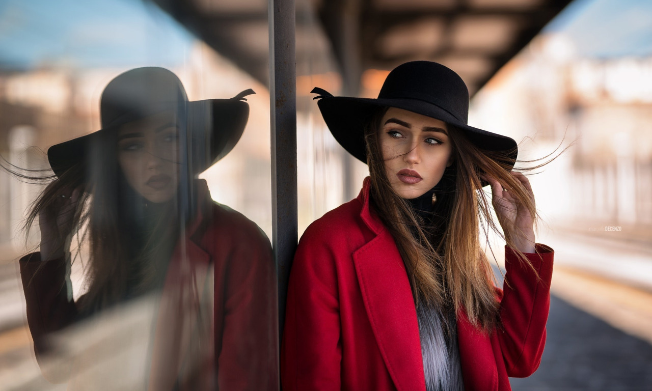 Назад к обои стекло, девушка, отражение, улица, здания, портрет, шляпа, макияж