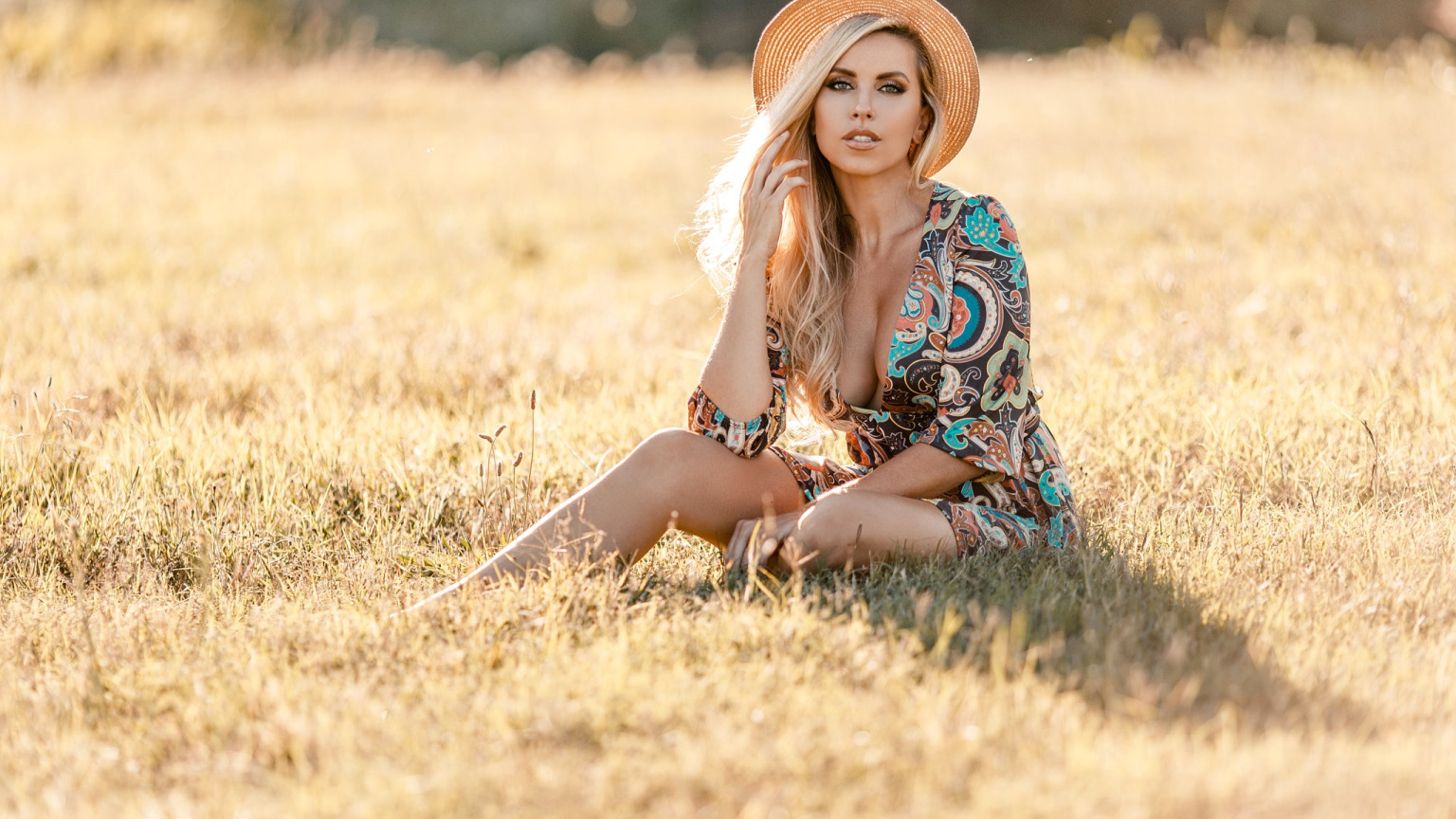 Назад к обои поле, взгляд, природа, шляпа, платье, блондинка, красиво, шляпка