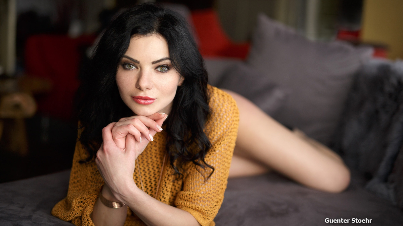 взгляд, желтый, поза, подушки, макияж, брюнетка, прическа, лежит
