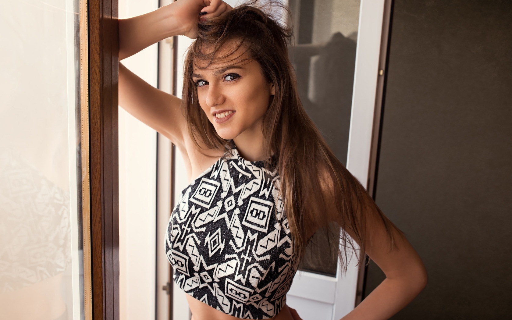 Назад к обои взгляд, поза, модель, портрет, макияж, прическа, шатенка, топик