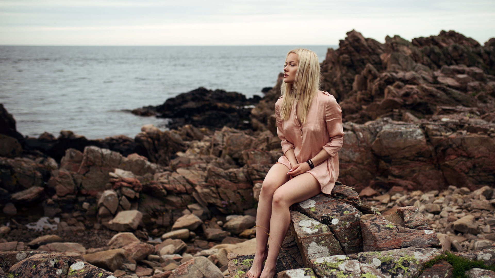 Назад к обои море, поза, камни, босиком, макияж, фигура, горизонт, прическа