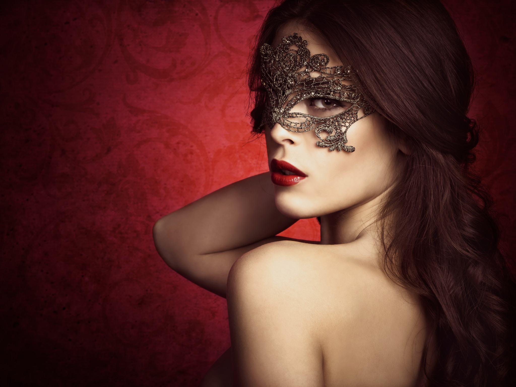 Назад к обои взгляд, девушка, лицо, фон, волосы, помада, маска, плечи