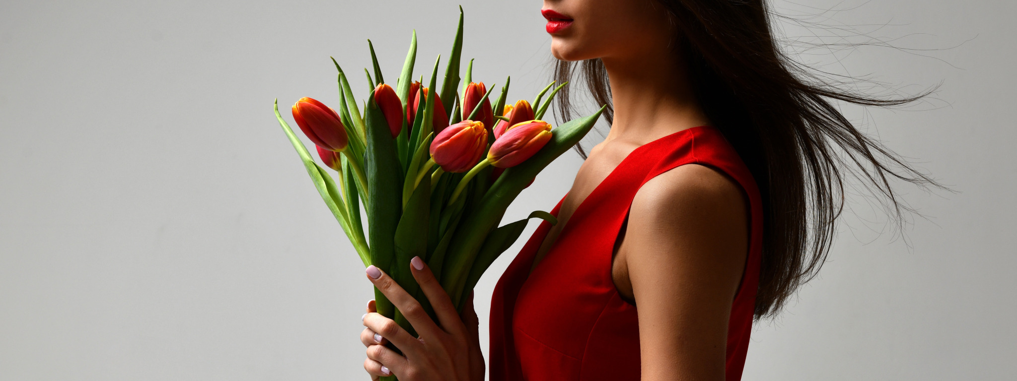 Назад к обои цветы, фон, букет, макияж, платье, брюнетка, прическа, тюльпаны