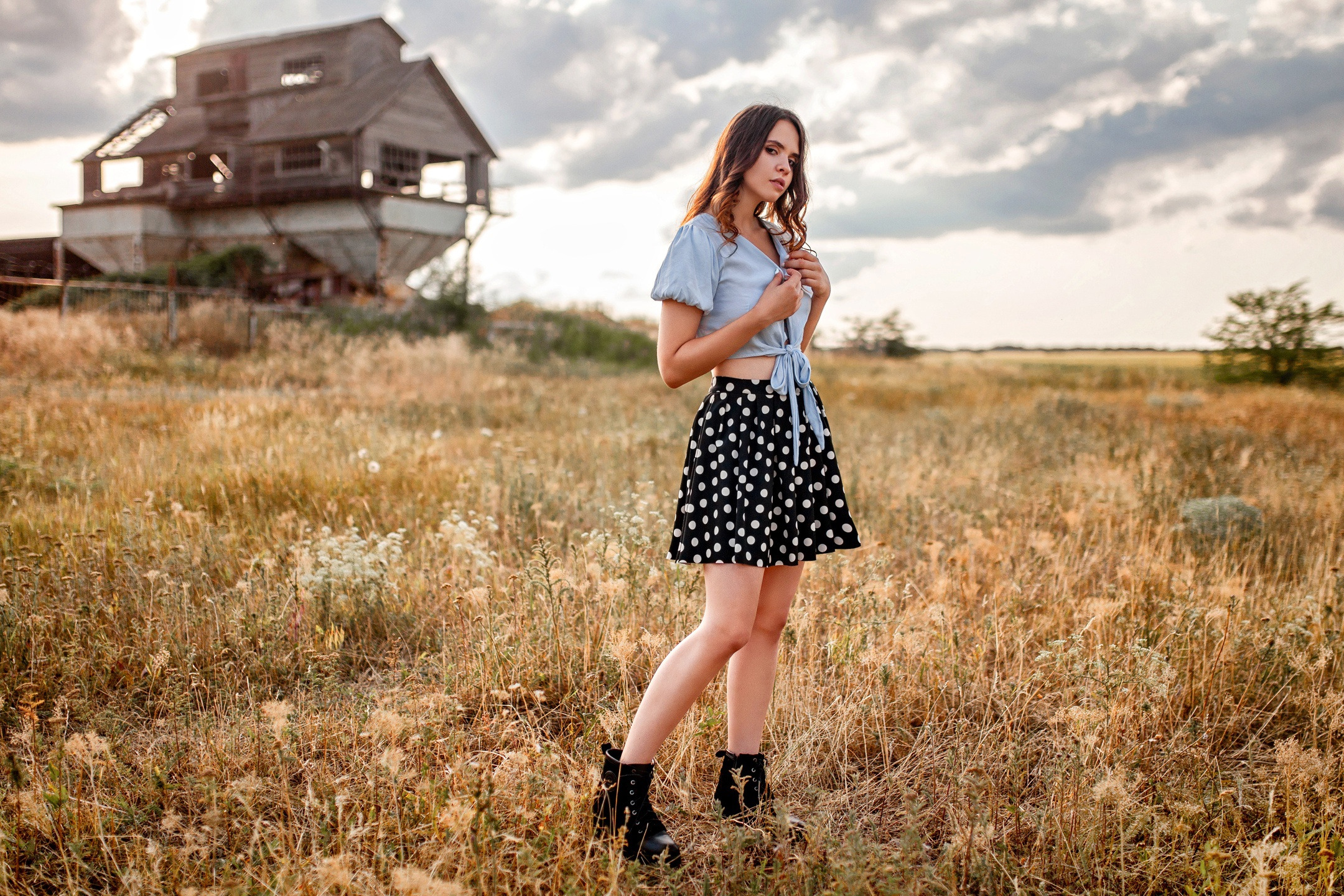 Назад к обои трава, взгляд, облака, природа, поза, модель, юбка, портрет