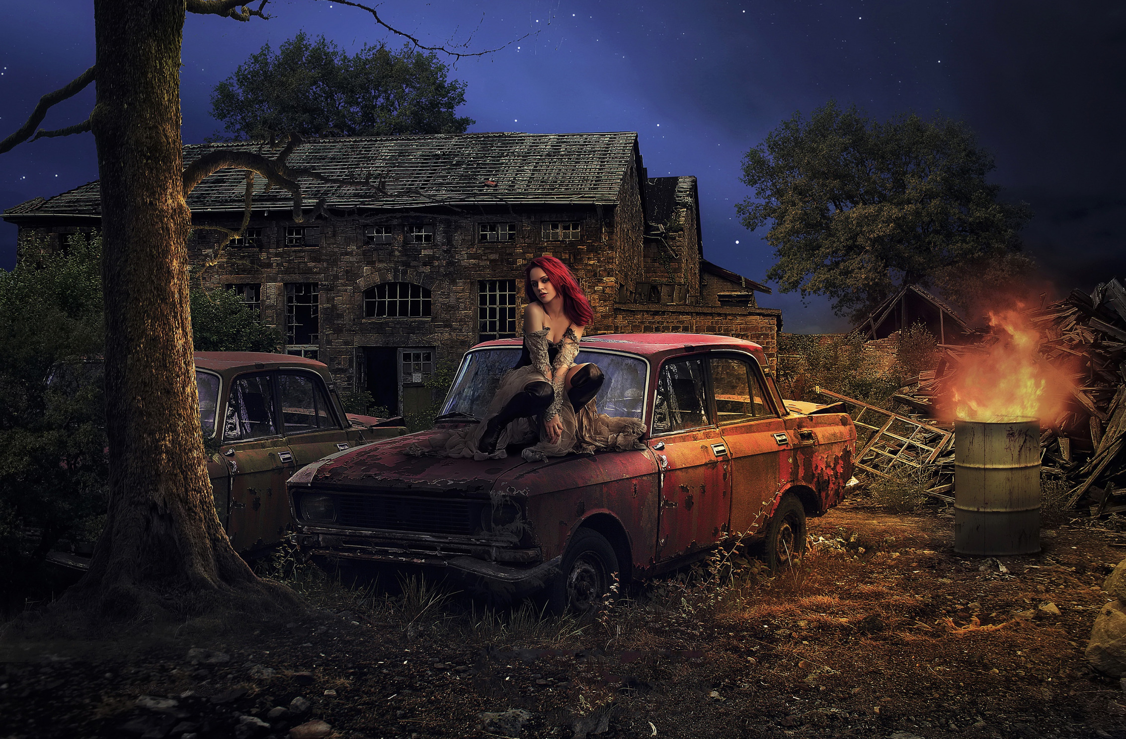 машина, девушка, развалины