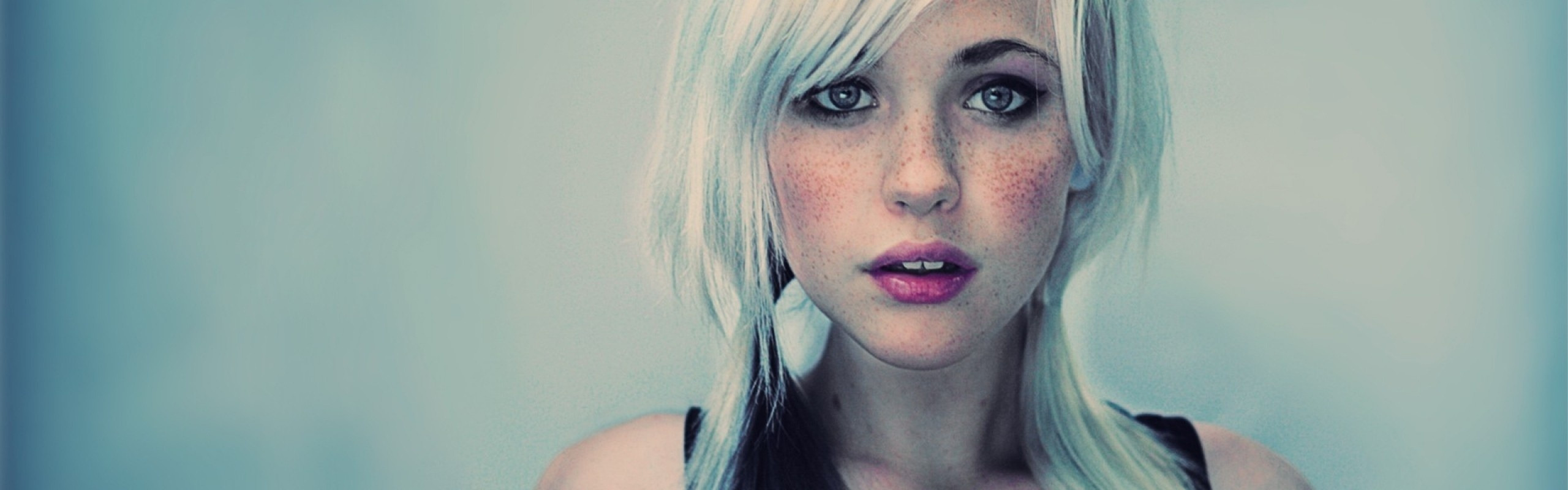 Назад к обои белый, девушка, блондинка, веснушки, белые волосы, хвостик, чёрная майка, Devon Jade