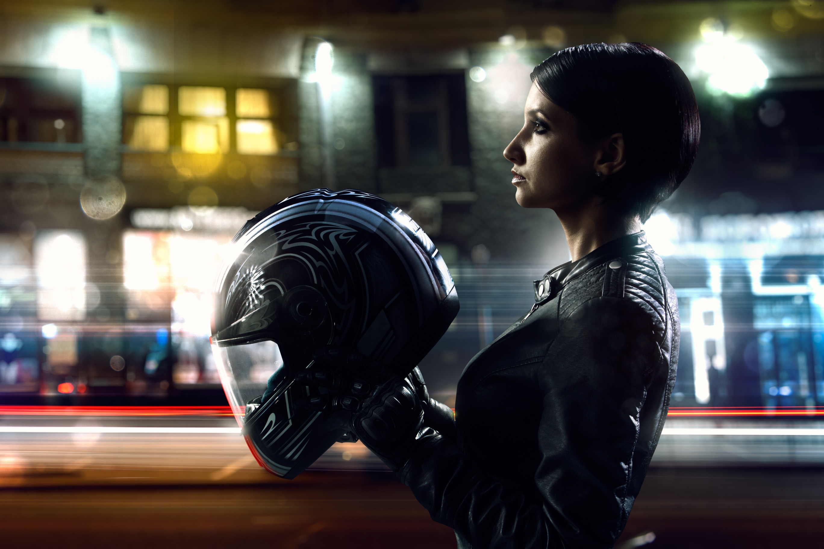 Назад к обои девушка, макияж, куртка, шлем, профиль, мотоциклистка