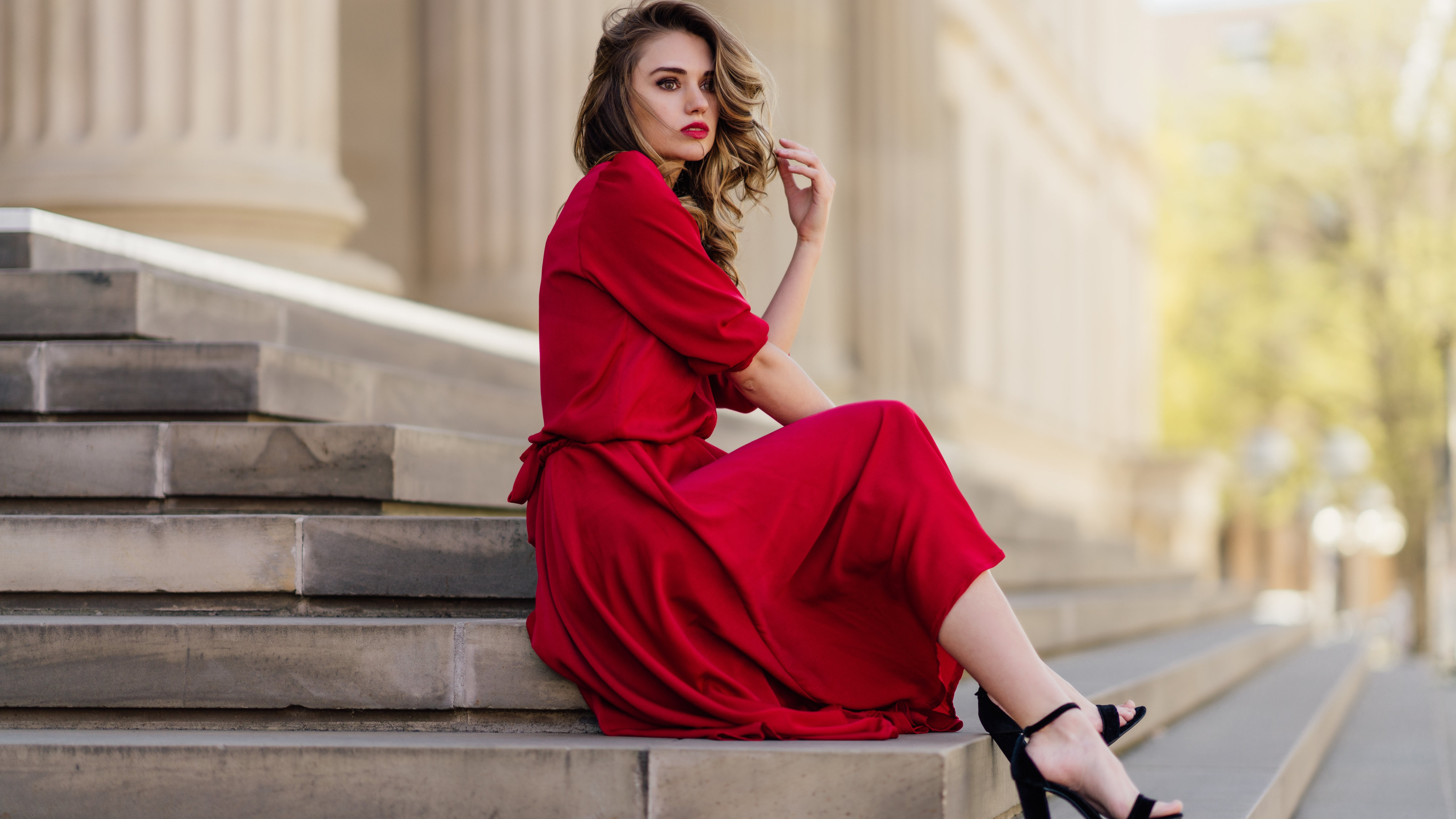 Назад к обои девушка, поза, лестница, ступени, красное платье, Andreas-Joachim Lins, Lea Er