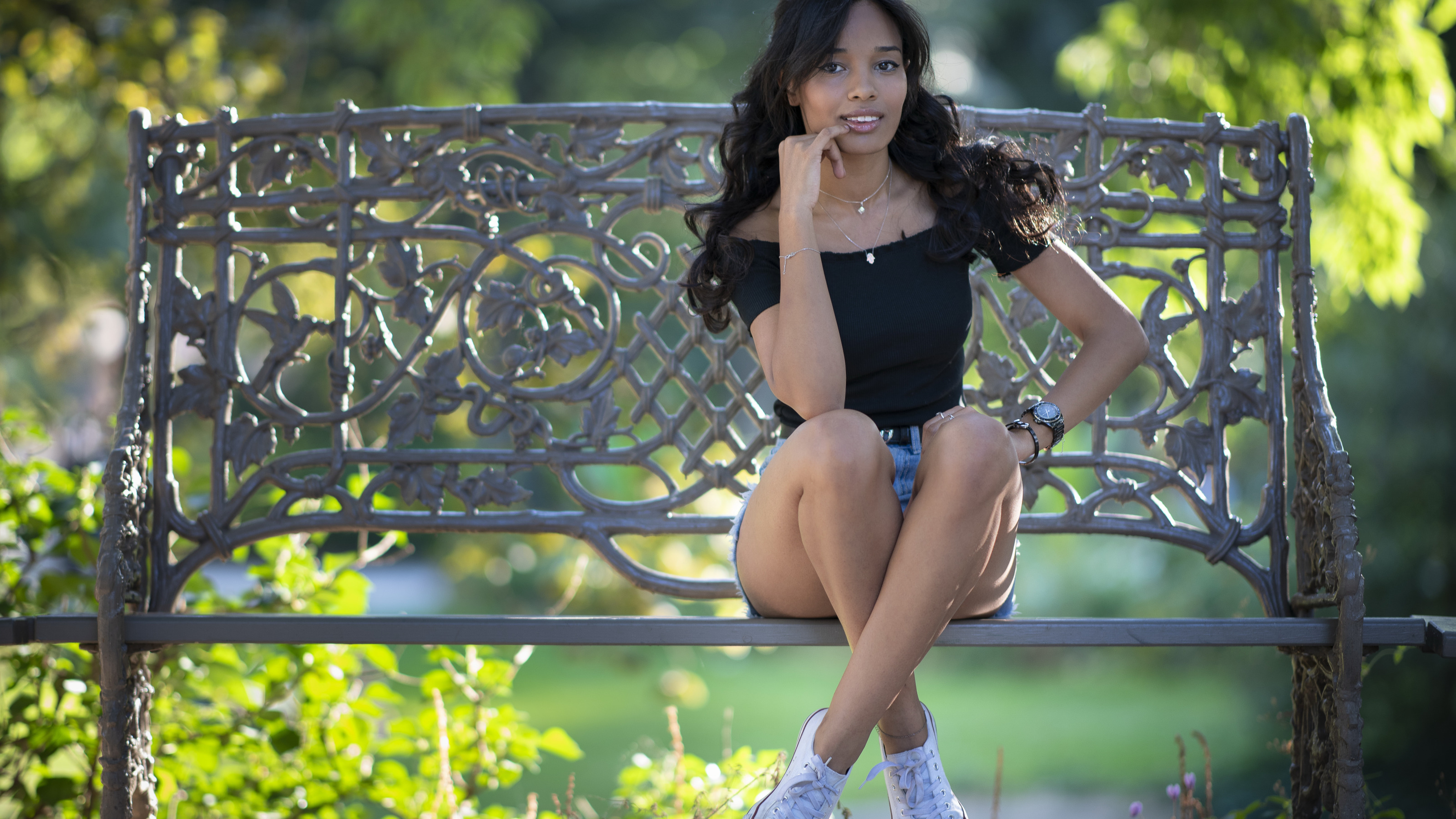 Назад к обои девушка, скамья, Majda