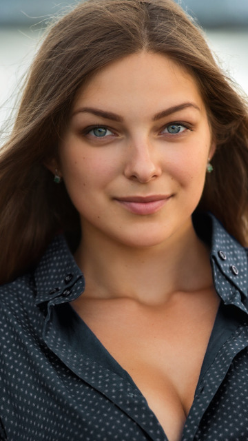 Назад к обои грудь, девушка, лицо, улыбка, портрет, рубашка, шатенка, Dasha