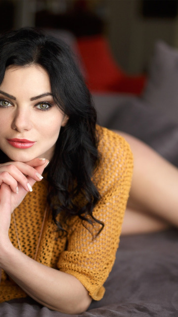 Назад к обои взгляд, желтый, поза, подушки, макияж, брюнетка, прическа, лежит