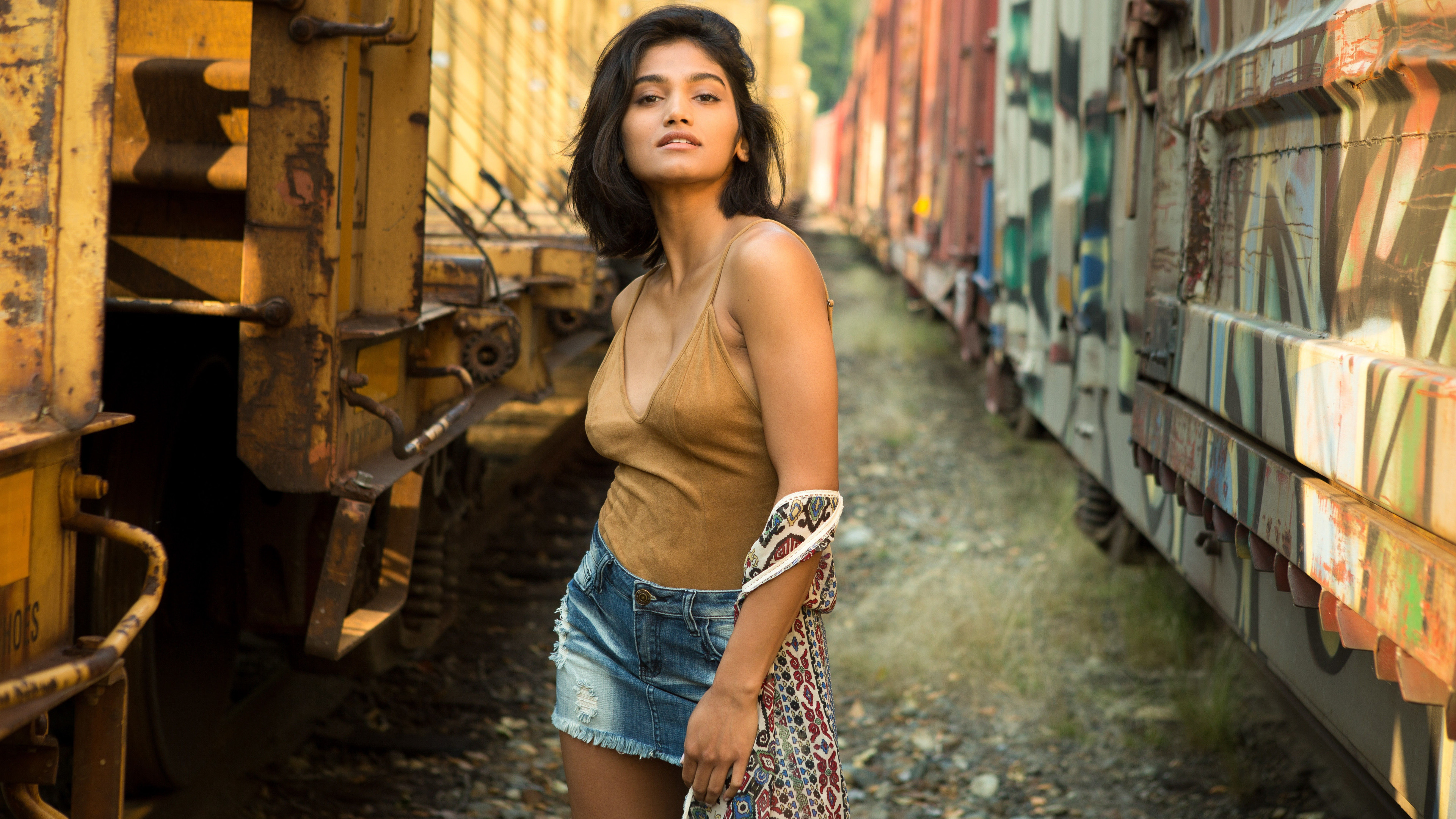 Назад к обои train, women, railway, brunette, hangar, denim skirt, METART, Blouses
