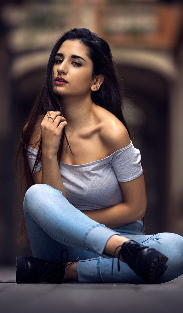 взгляд, поза, модель, портрет, джинсы, макияж, майка, брюнетка