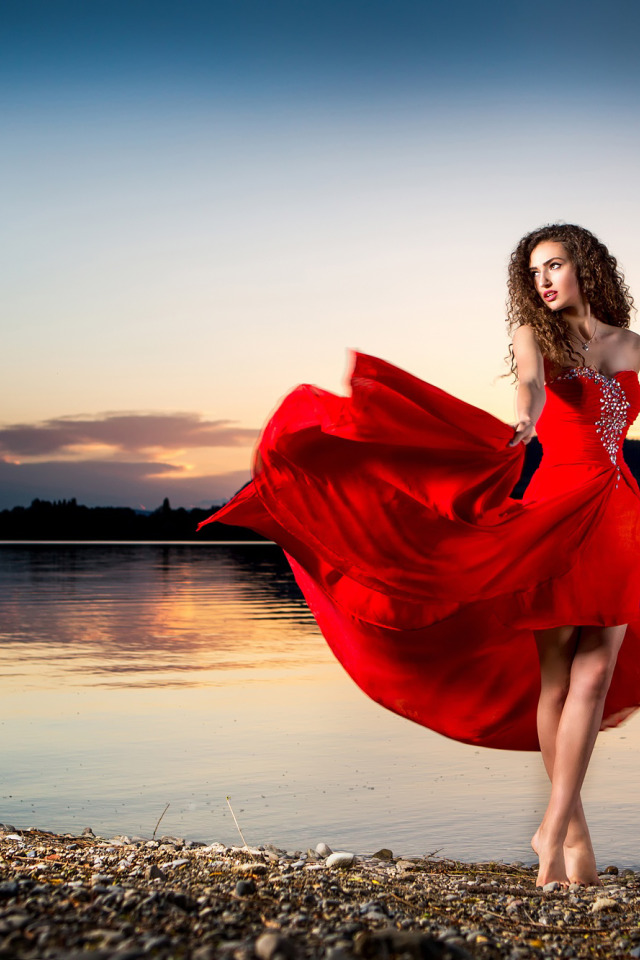 Назад к обои девушка, берег, танец, платье, в красном, sunset dance